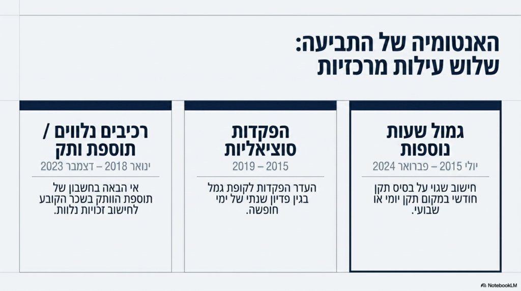 הסכום המשמעותי ביותר בפשרה – 4,804,995 ש"ח – הגיע מעילה אחת מרכזית: חישוב שעות נוספות לפי תקן חודשי במקום יומי או שבועי.